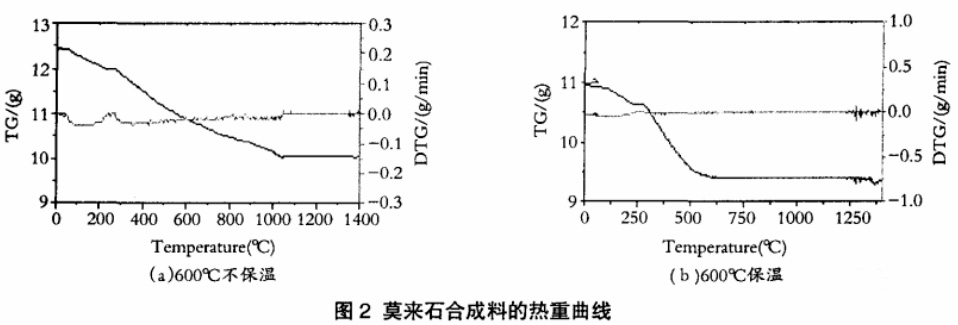 由于DSC-TG分析的測量用料量大多≤100mg,并且要磨成細粉。這種實驗方法很難代表混合料實際的情況,且缺乏均勻性和代表性,從動力學上也不能反映澆注料加熱過程的實阮變化情況。目前對于尺寸和質(zhì)量大的試樣,只能通過試樣加熱前后質(zhì)量的變化來表征總的反應(yīng)情況。用整體的樣塊大試樣加熱更接近真實。大試樣熱重儀對烘干后的試樣進行熱重分析,測定室溫至1400℃過程中重量的變化,結(jié)果如圖2(a)所示。由圖可知,在連續(xù)加熱不保溫的情況下,質(zhì)量一直到1100℃才保持穩(wěn)定。根據(jù)DSC-TG及大試樣熱重分析結(jié)果,混合料在1200℃以上均可生成莫來石,只是莫來石的生成速度和轉(zhuǎn)化率隨溫度不同而會有所差異。本工作的主要目的是合成具有微孔結(jié)構(gòu)的莫來石骨料,既要求合成料有一定的氣孔率,孔徑小、體密輕,又要求其強度高,即要有理想的莫來石轉(zhuǎn)化率,同時還要兼顧煅燒設(shè)備投資、生產(chǎn)成本等,因此摸索理想熱處理制度對本工作而言至關(guān)重要。